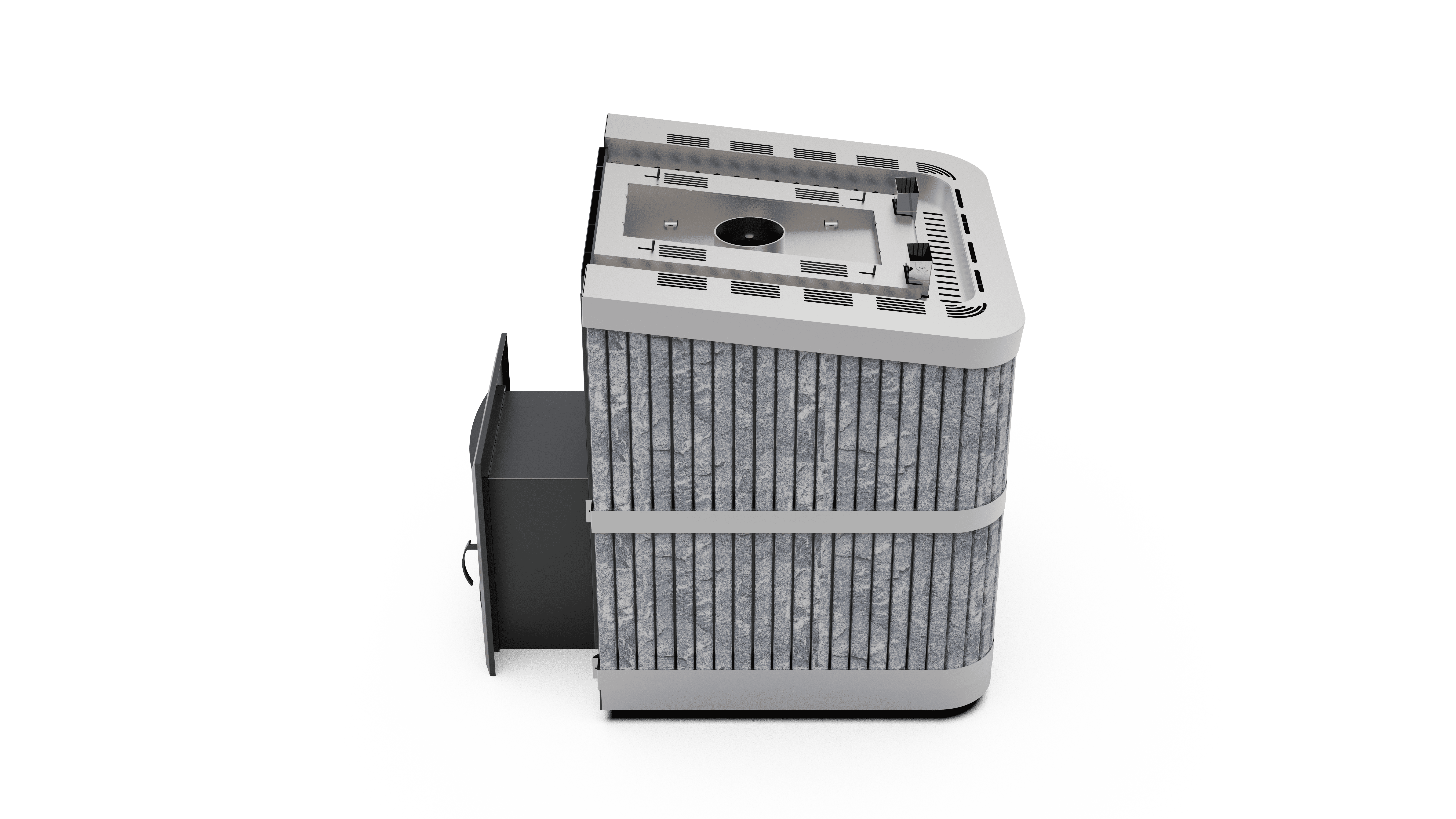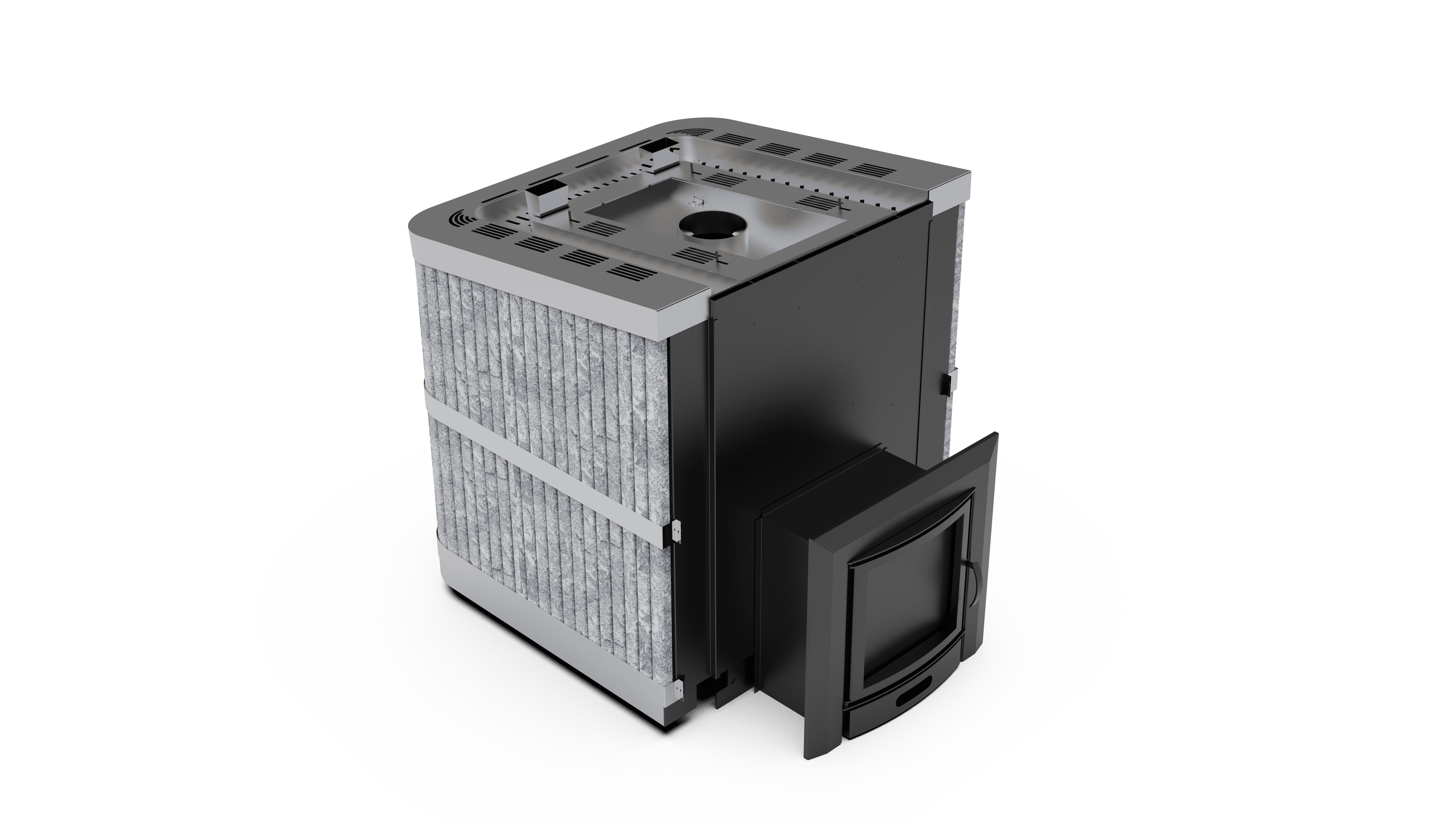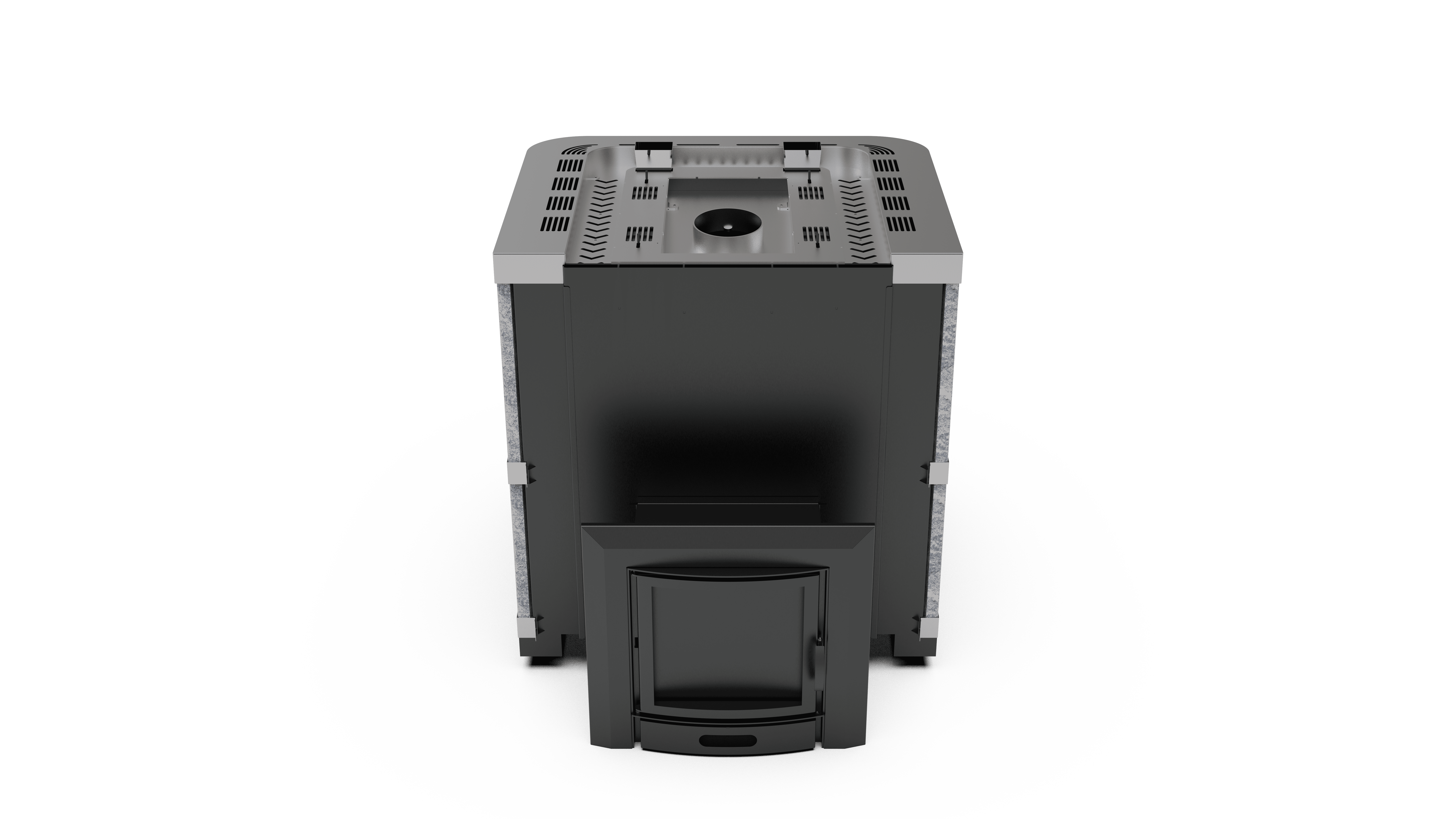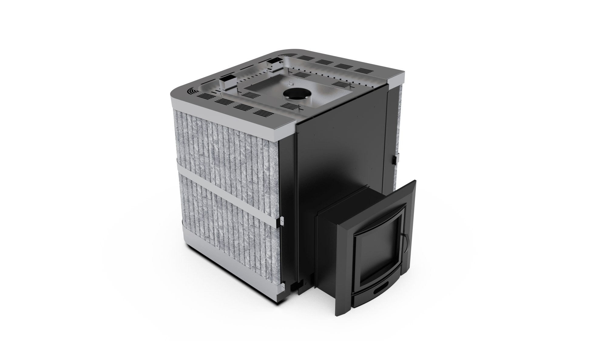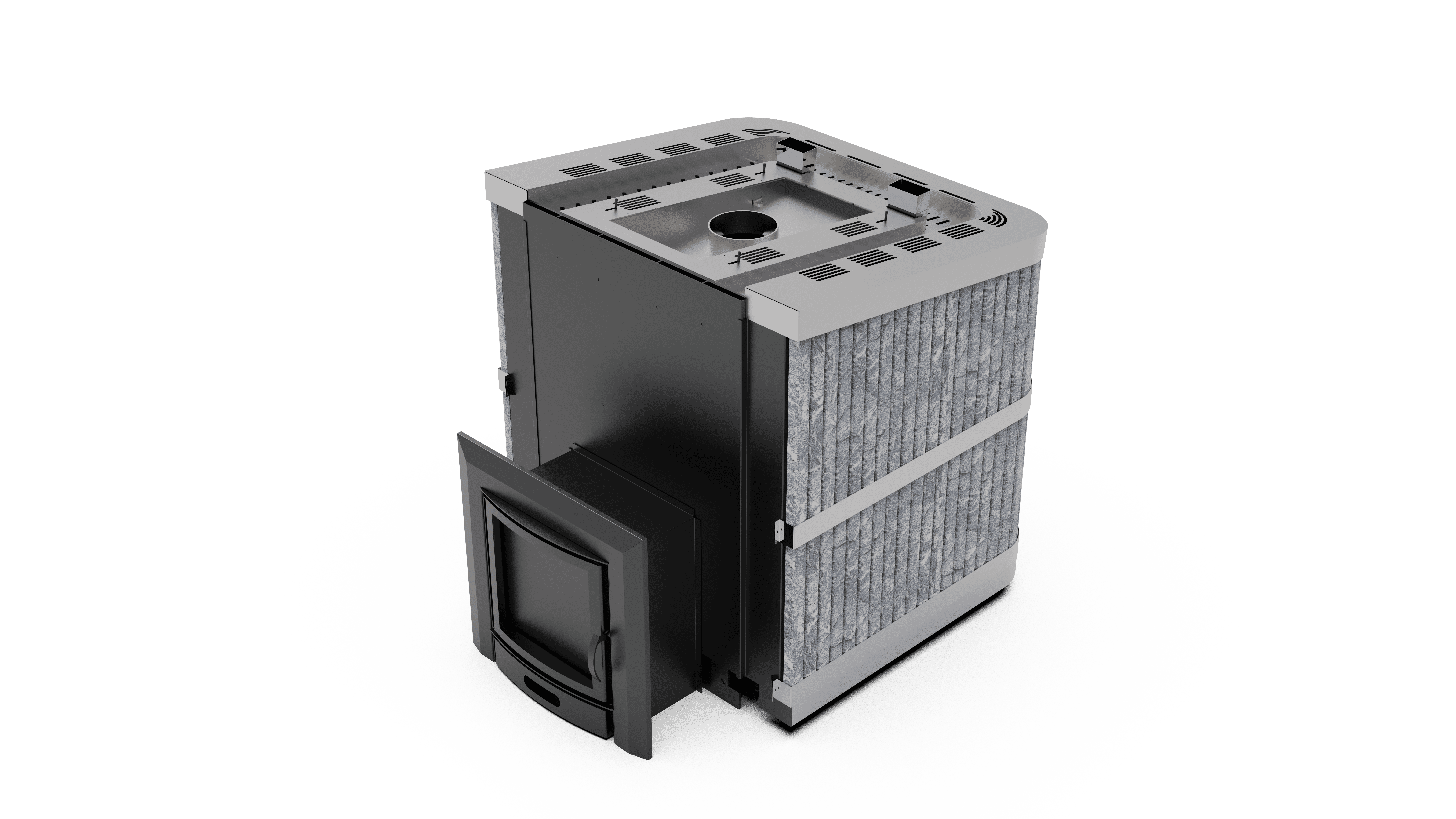 Основной пар формируется от закрытой каменки. Температура внутри каменки может достигать 600 °C, что обеспечивает получение плотного, мелкодисперсного пара, близкого к классическому «русскому». Масса камней в закрытой каменке составляет 200–240 кг, благодаря чему печь уверенно держит тепло и позволяет проводить подряд несколько сеансов парения без остывания.