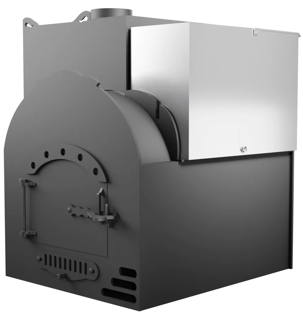 В комплектации данной модели предусмотрена система воздушного отопления, которая способна обогреть комнату отдыха до 40 м3. В конструкции печи предусмотрен дополнительный контур. Система подключается к электричеству, вентилятор подает холодный воздух, который прогреваясь от печи выходит в комнату отдыха. В комплект входит, вентилятор, гофрированная труба 1 метр, хомуты и обратный клапан.