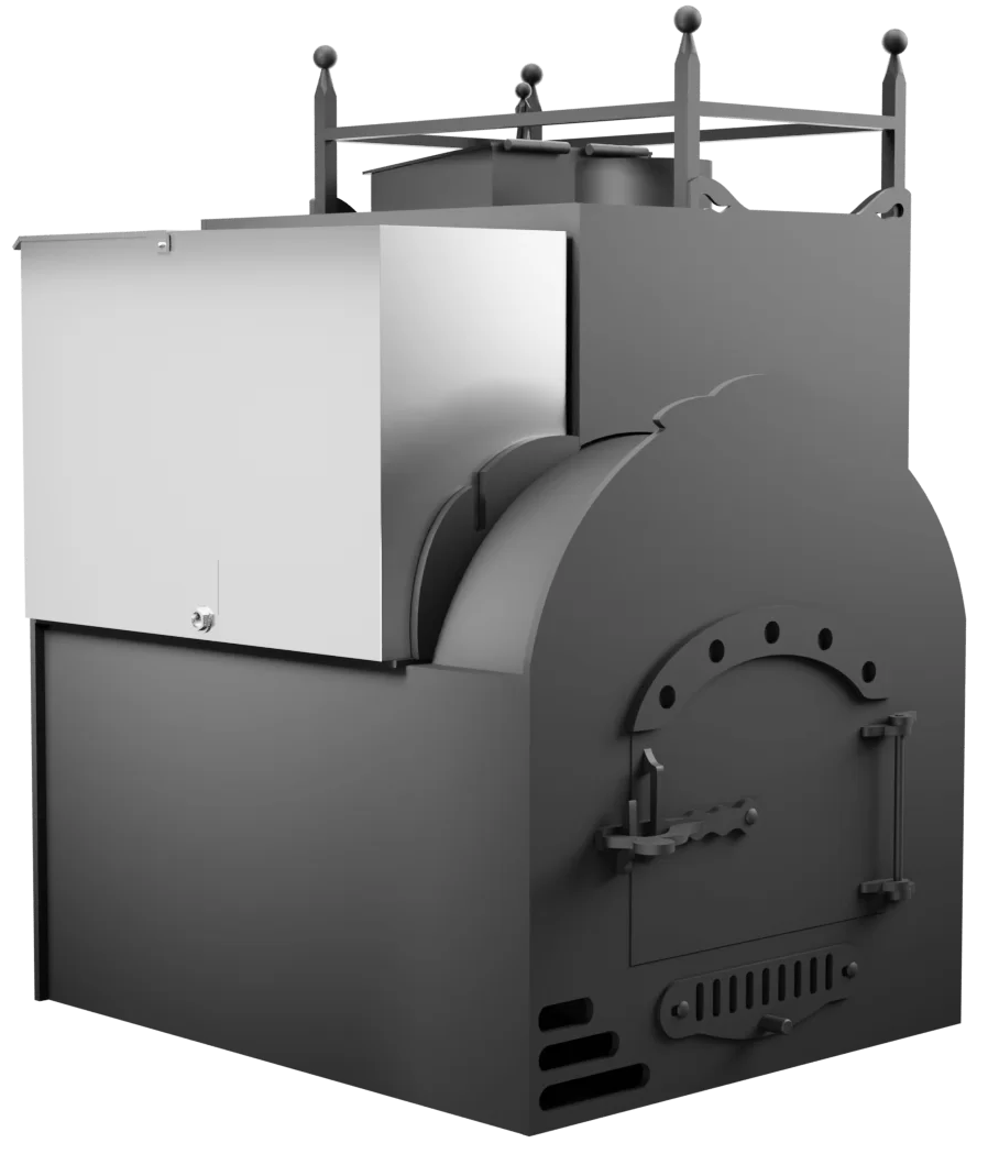 Закрытая каменка с дверцей для подачи пара. Такая каменка дает эффект «русской бани» Камни расположены внутри каменки и нагреваются до более высокой температуры в сравнении с открытой каменкой и остаются дольше горячими.
