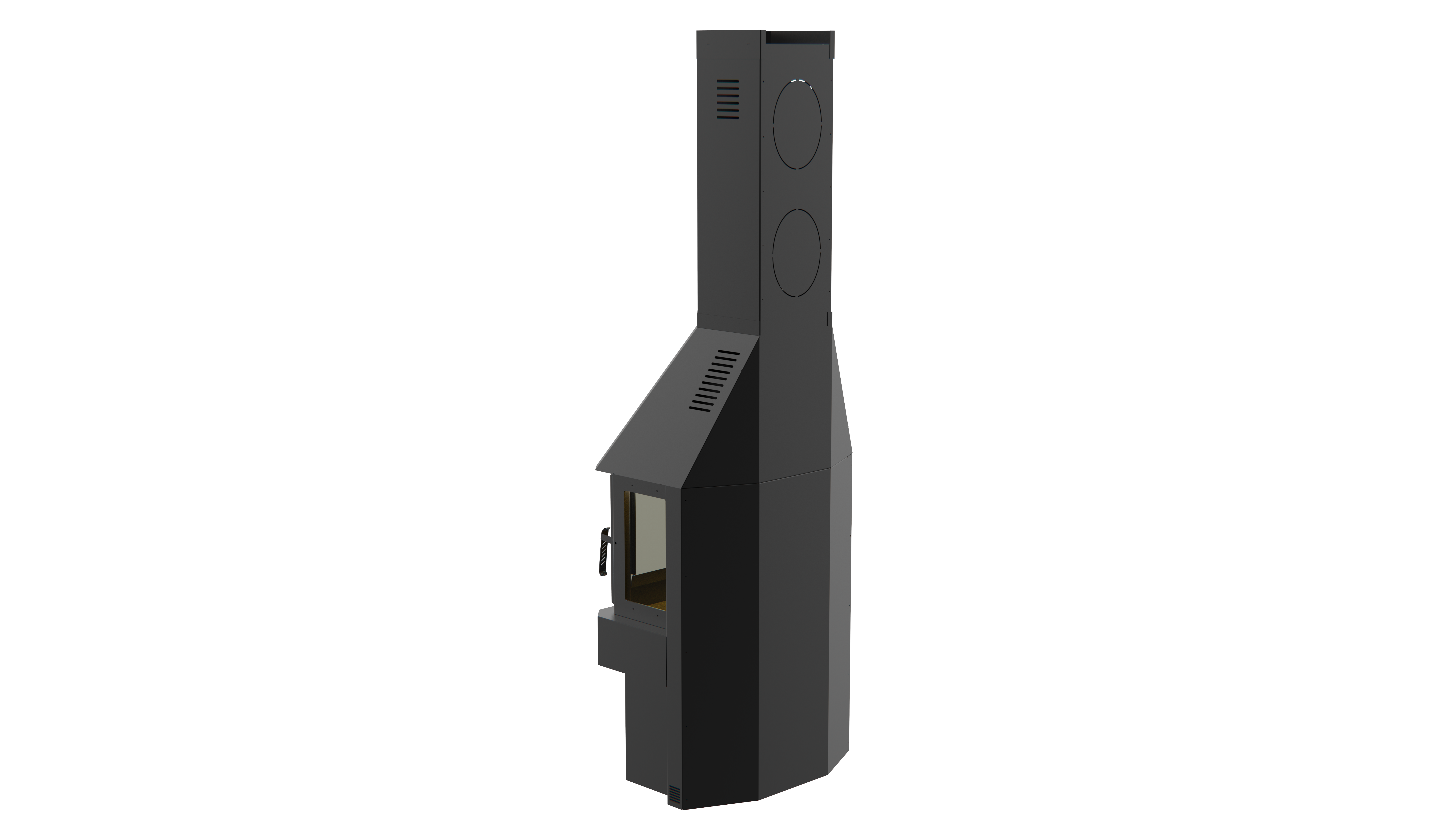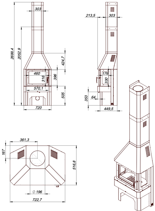 В нижней части конструкции размещена встроенная дровница для хранения запаса дров.